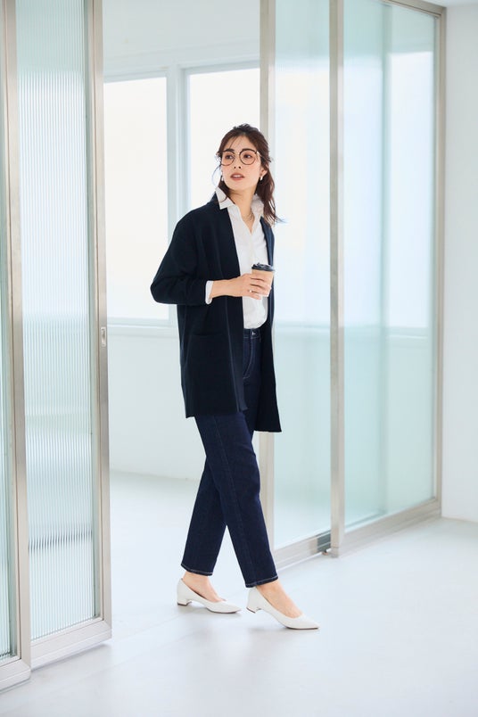 デイリーをエレガンスな印象に変える今年らしさ溢れるニットコーディガン。シャツ×デニムのカジュアルな装いもコーディガンがスマートに包み込んでくれる。