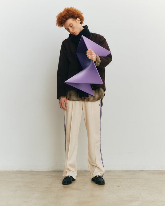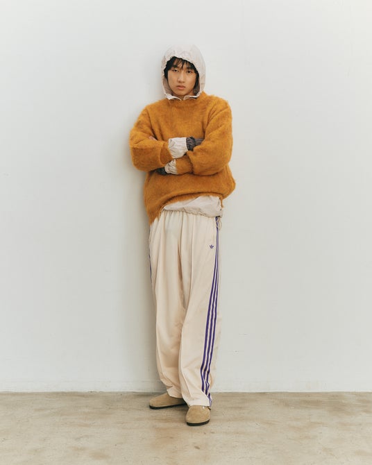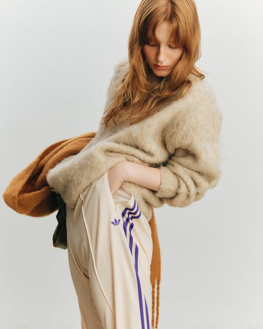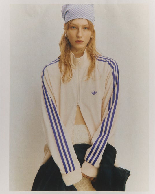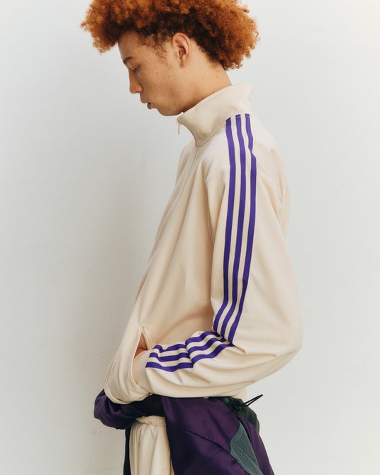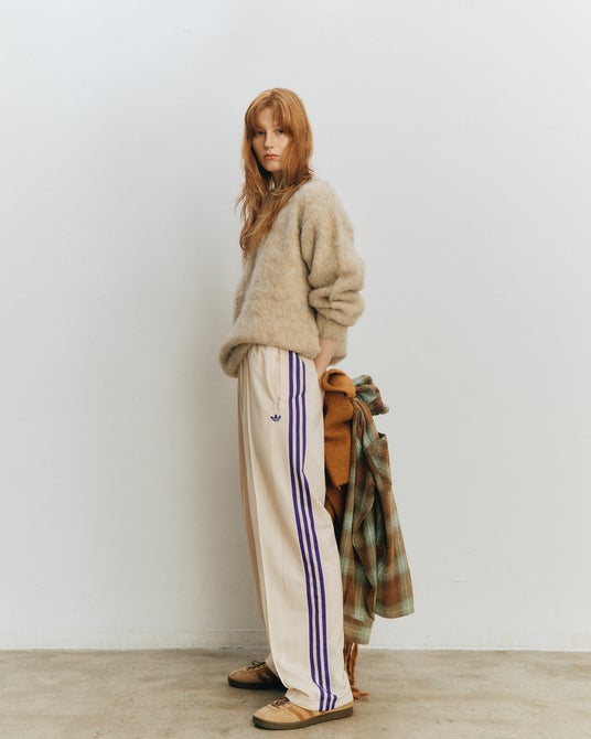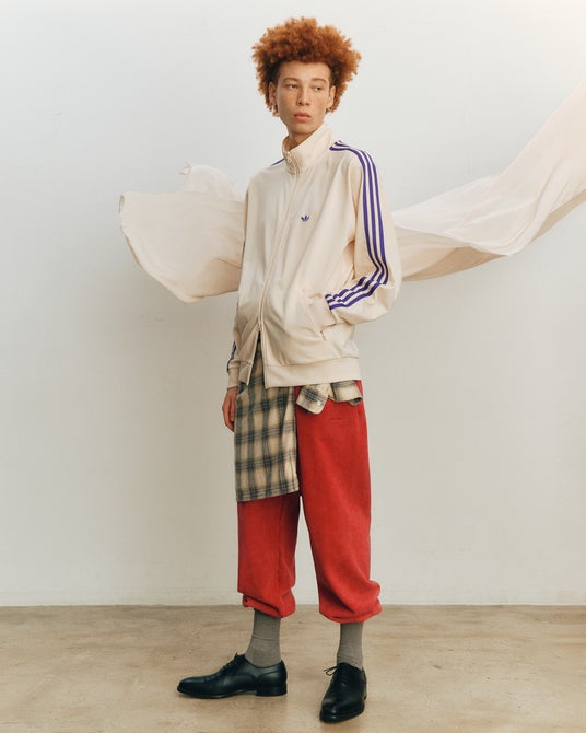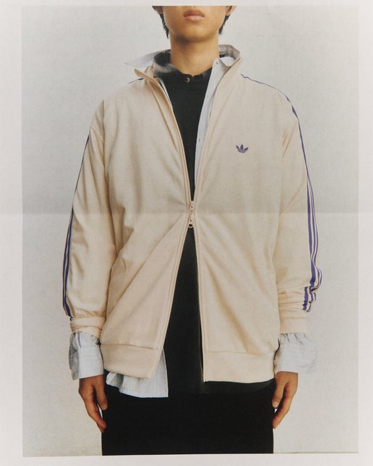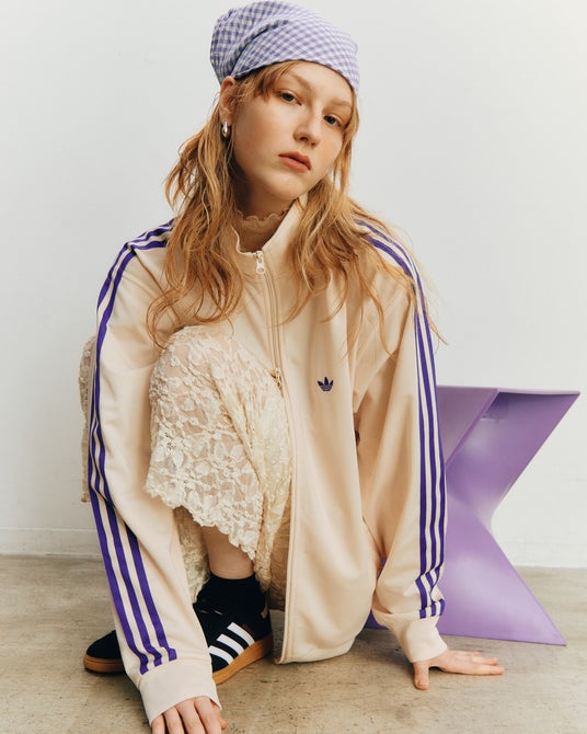 アイテムはオフホワイトのボディにadidas Originalsのアーカイブから着想を得た、パープルのスリーストライプを配したデザインとなっている。