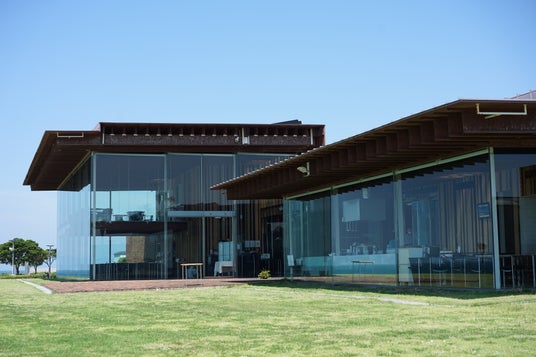 太陽のリフレクションが精巧に設計された美しい建築は、世界的建築家 隈研吾氏によって2001年に作られた作品「海/フィルター」。