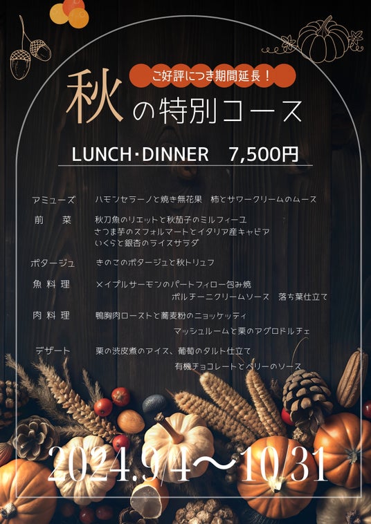 美味しいものが溢れている”食欲の秋”、季節の味覚を満喫してほしいとの願いもあり誕生したコースとなっております。