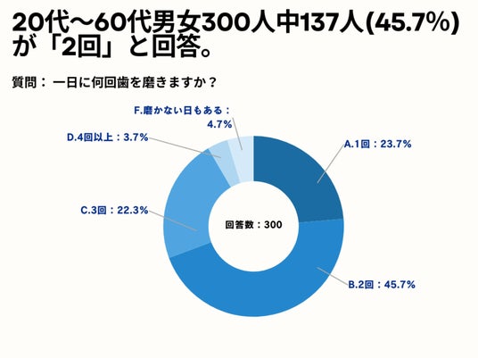 20~60代男女を対象とした「一日に何回歯を磨きますか?」というアンケートでは、300人中「A.1回」(23.7%)、「B.2回」(45.7%)、「C.3回」(22.3%)、「D.4回以上」(3.7%)、「E.磨かない日もある」(4.7%)という結果になりました。