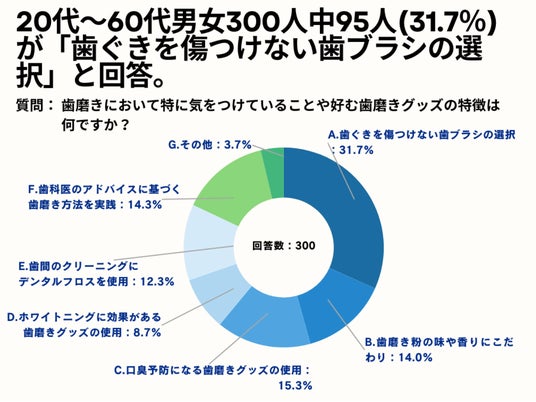 また、「 歯磨きにおいて特に気をつけていることや好む歯磨きグッズの特徴は何ですか?」というアンケートで最も多かった回答は「A.歯ぐきを傷つけない歯ブラシの選択」で全体の31.7%となり、次いで「C.口臭予防になる歯磨きグッズの使用」が15.3%、「F.歯科医に基づく歯磨き方法を実践」が14.3%という結果になりました。