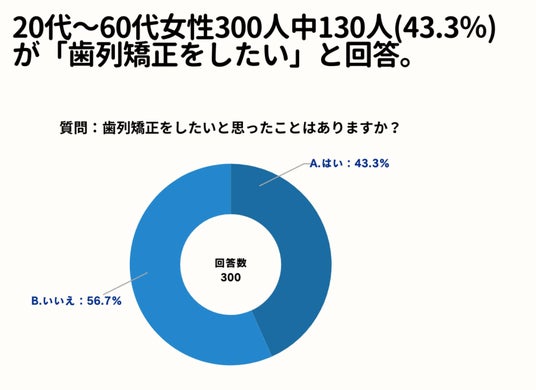 「歯列矯正をしたいと思ったことはありますか?」というアンケートで「A. はい」が全体の43.3%となりました。