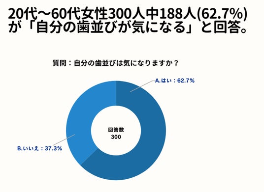 20~60代女性を対象とした「 自分の歯並びは気になりますか?」というアンケートで「A.はい」(62.7%)、「B.いいえ」(37.3%)という結果となりました。