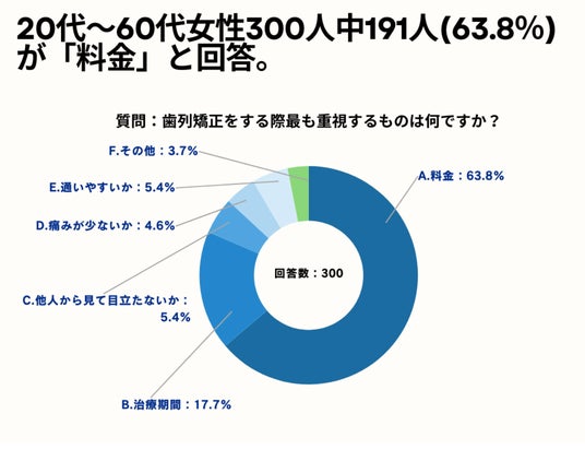 また、「歯列矯正をする際最も重視するものは何ですか?」というアンケートで最も多かった回答は「A.料金」で全体の63.8%、次いで「B.治療期間」が17.7%という結果になりました。