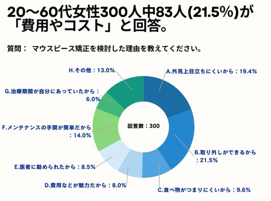 また、「マウスピース矯正を検討した理由を教えてください」というアンケートで最も多かった回答は「B.取り外しができるから」で全体の21.5%となり、次いで「A.外見上目立ちにくいから」が19.4%という結果になりました。