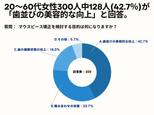「マウスピース矯正を検討する目的は何になりますか?」というアンケートで最も多かった回答は「A. 歯並びの美容的な向上」で全体の42.7%となりました。次いで多かったのが「B. 嚙み合わせの改善」(33.7%)という結果になりました。