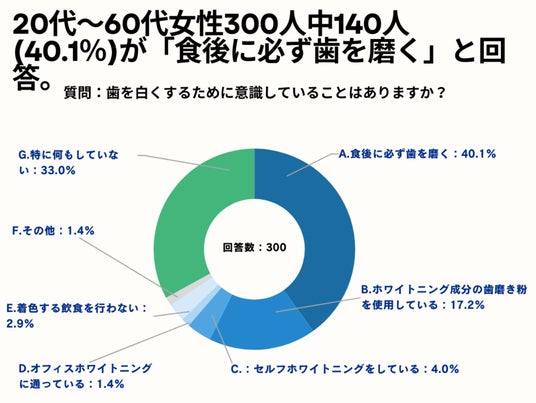 「歯を白くするために意識していることはありますか?」というアンケートで「A. 食後に必ず歯を磨く」が全体の40.1%となりました。次いで「G.特に何もしていない」33%、「B.ホワイトニング成分の歯磨き粉を使用している」17.2%という結果になりました。