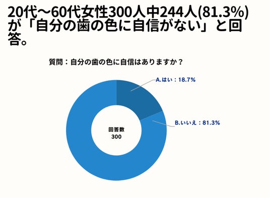 20~60代女性を対象とした「自分の歯の色に自信はありますか?」というアンケートで「B.いいえ」(81.3%)という結果となりました。