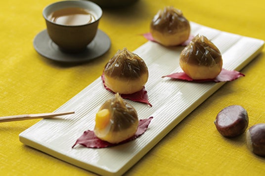 じっくりと密漬けした1粒栗を、栗そぼろをまとったお餅と栗あんで包みました。