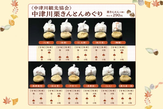 各店舗の栗きんとんは、形は似ていますが色・風合い・包みなど、個性が光ります。味比べはもちろん、11種類すべてのテイスティングや店舗名当てなど、お客様のお好みの食べ方で「中津川栗きんとんめぐり」をお楽しみください。
