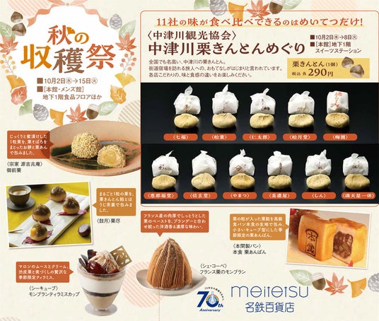 計11店舗の栗きんとんを1個から買える「中津川栗きんとんめぐり」は名古屋では名鉄百貨店限定開催!その他の店舗からも、栗を使った魅力的なスイーツが多数登場します。