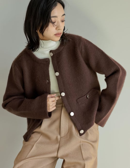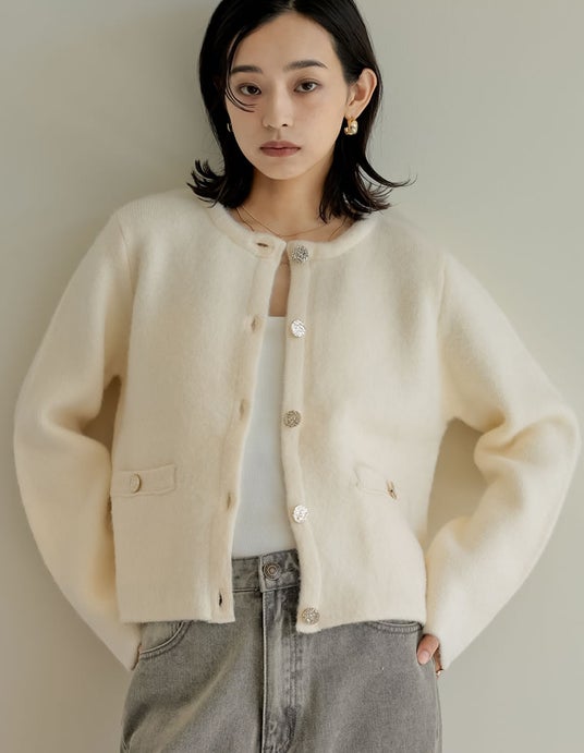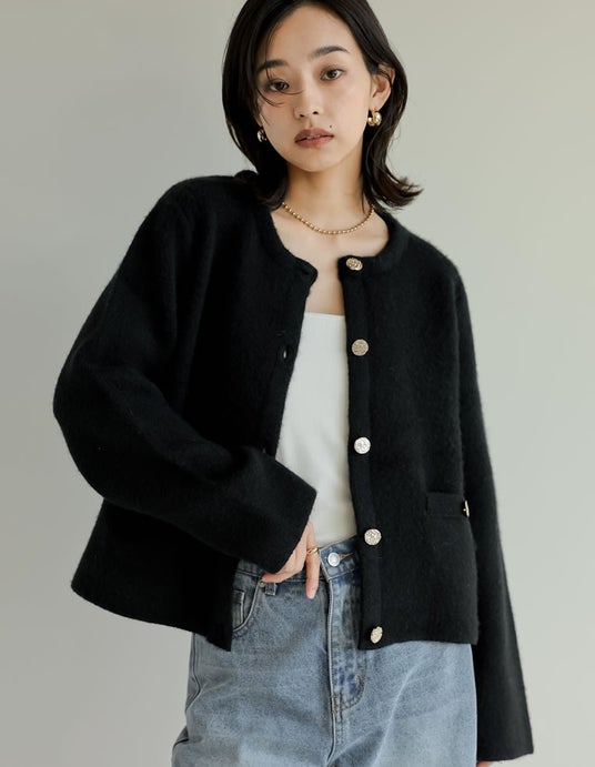 ふんわりとした暖かみのあるニットを使用した金ボタンカーディガン。