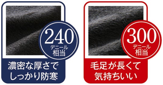 暖かさに潤い機能をプラスした商品です。コラーゲン、CICA、セラミド、グリセリンの 4つの成分を配合した素材で、しっとりやわらかいさわり心地です。さらに、240デニール、300デニール相当の厚手生地で、肌に当たる部分は毛布のようにふわふわしたさわり心地が特長です。
