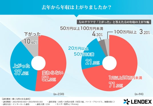 「去年から年収は上がった?」という質問に対して、52.00%が「変わらない」と回答した一方で、37.60%の女性は「上がった」と答えています。