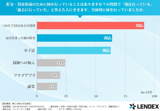 資産形成を実践している女性たちの具体的な取り組みとしては、「つみたてNISAなどの投資」90人(70.87%)が最も多く、「毎月決まった額の貯金」64人(50.39%)や「ポイ活」63人(49.61%)もポピュラーな手段として活用されています。これらの結果から、働く女性たちはリスクの低い投資商品や日常生活での節約を通じて、少しずつ資産を増やしていることがわかります。