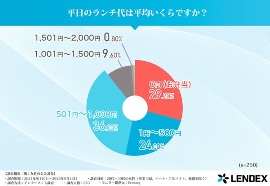 一方で「0円(お弁当)」と答えた女性も29.20%おり、約3割の女性が日々のランチ代を節約するためにお弁当を持参していることがわかります。さらに、「1円~500円」という層も24%と、節約志向の女性が多いことが示されました。