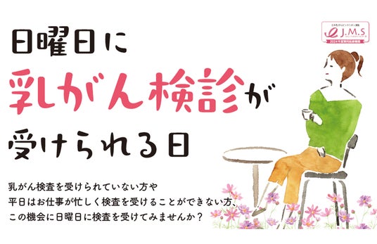 ジャパン・マンモグラフィーサンデー(J.M.Sプログラム)は、子育て、介護、仕事など多忙な平日を過ごす女性のために、「10月第3日曜日に全国どこでもマンモグラフィ検査が受診できる環境作り」への取組みです。