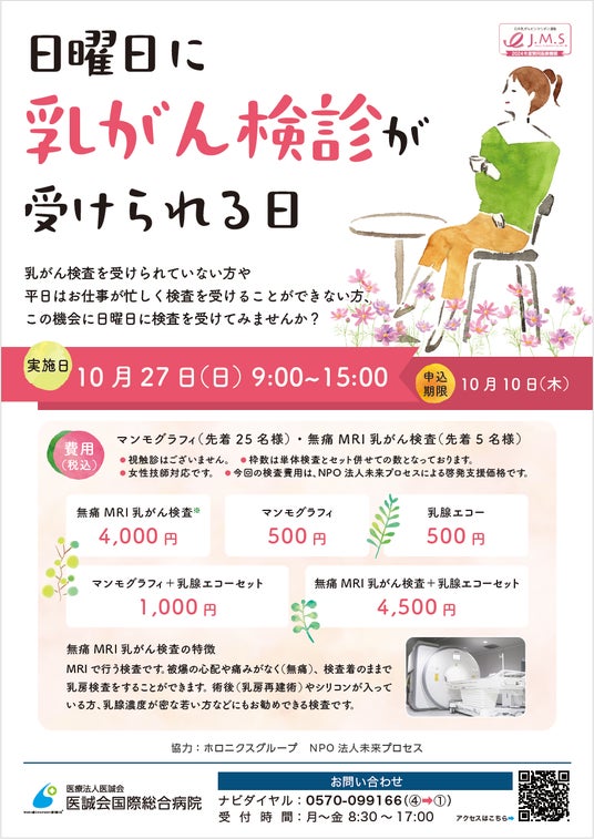医療法人医誠会(本社:大阪府大阪市、代表者:谷幸治)は、乳がん検診の重要性を啓発するため、認定NPO法人J.POSH(日本乳がんピンクリボン運動)主催の「ジャパン・マンモグラフィーサンデー」に賛同参加し、10月27日(日)に医誠会国際総合病院で乳腺MRIを使用した乳がん検診を実施します。平日は忙しい女性や乳腺濃度が高い方に向け、被爆の心配なく痛みもない検査を提供します。