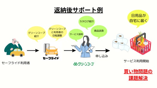 免許返納後の交通手段やお買い物の方法について、グリーンコープ生協や自治体、企業のサービスと連携し、免許返納の最大の課題である”交通手段と買い物問題”の課題解決に取り組んでいます。