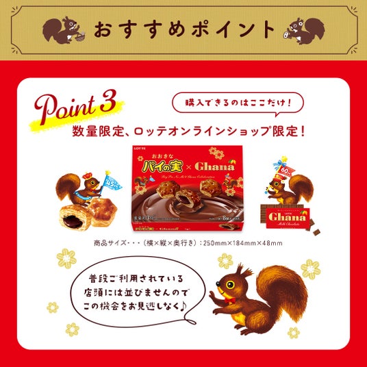 株式会社ロッテはチョコレート事業60周年の記念商品として、発売45周年を迎えるロングセラーブランド「パイの実」 と、発売60周年を迎えるロングセラーブランドのガーナミルクがコラボレーションした 『おおきなガーナパイの実』を10月1日(火) 正午よりロッテオンラインショップにて12,000個の数量限定で発売いたします。