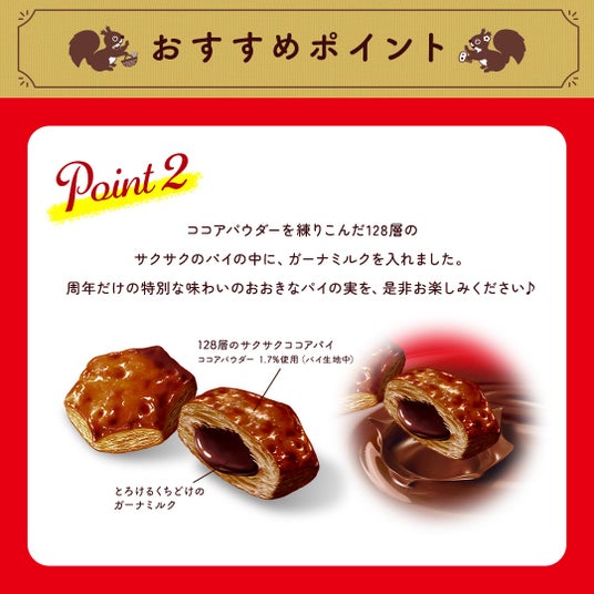 通常のパイの実の2倍、128層のココアパイの中にガーナミルクを入れました。おおきなパイの実ならではのサクサク食感なパイとガーナミルクのとろけるくちどけのハーモニーを堪能できる商品です。