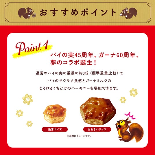 発売45周年を迎えるパイの実と、60周年を迎えるガーナミルク。人気を誇る二つのブランドが、お客様への感謝の気持ちを込めて、この度夢の初コラボレーション商品として実現しました。「パイが主役」であるパイの実のサクサク食感とガーナミルクのとろけるくちどけといった、両者の魅力を融合させた味わいを、食欲の秋の小腹が空いた時や、食後のデザートなど様々なシーンでお楽しみください!