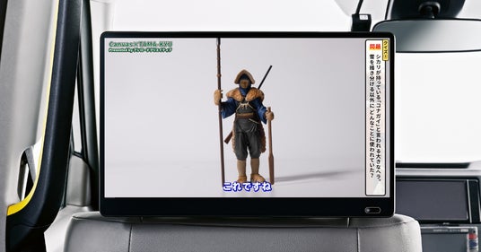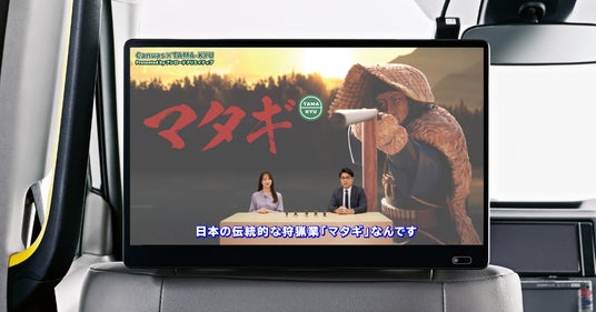 モビリティ車窓メディア「Canvas」には、「TAMA-KYU」のロゴクリエイティブを投影します。車内では、タクシーで放映中の移動時間の情報番組「HEADLIGHT」MCである森香澄さん・安東弘樹さんがクイズも交えながら、知られざるマタギの魅力に迫った約10分間の特集映像を放映するなど、『TAMA-KYU 5周年タクシー』でしか見られない周年特別コンテンツもお楽しみいただけます。