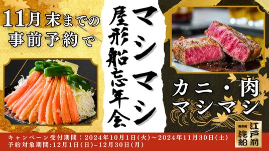 浜友グループの江戸前汽船株式会社(本社:東京都江東区、代表取締役:後藤武彦)は、11月29日より「カニ・肉マシマシ 屋形船忘年会キャンペーン」を開催することををお知らせいたします。