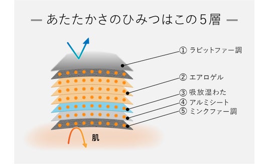 宇宙服にも使用される断熱素材「エアロゲル」を採用し、さらに吸放湿わたとアルミシートを組み合わせた独自考案の5層構造により、mofua史上最高の暖かさを実現。