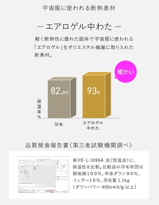 エアロゲルとは軽くて断熱性能が高く宇宙服にも採用されている高機能素材です。毛布にエアロゲルを練り込んだ中わたを使用することで、羽毛布団と比較して保温率が約10%高い結果が出ました。