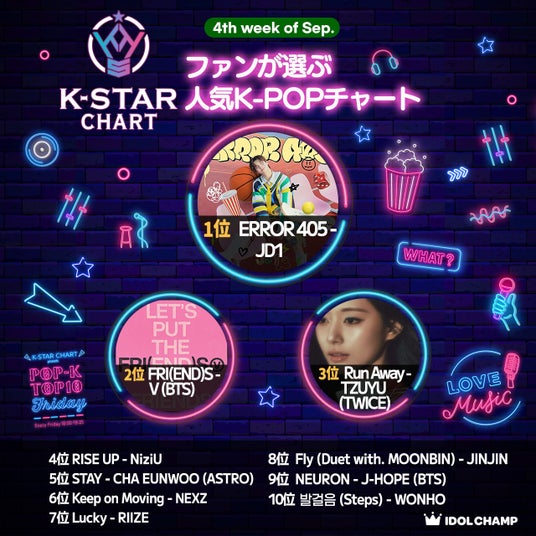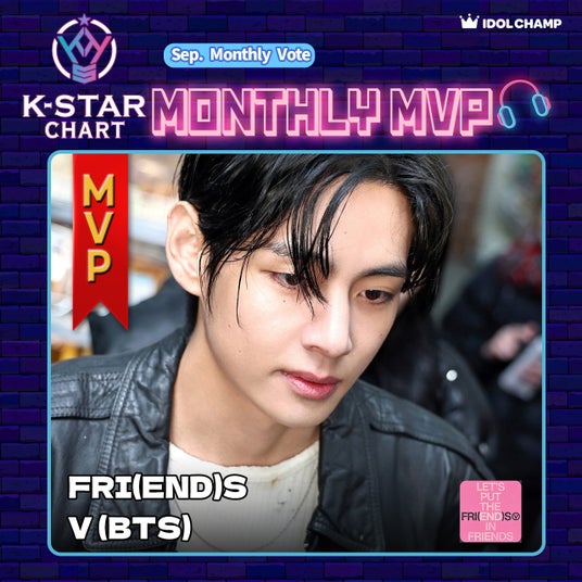 『K-STAR CHART presents POP-K TOP10 Friday』週間チャートの投票数をベースに算出された9月の累計ポイント数で決まる月間チャート1位は V (BTS)の「FRI(END)S」となり9月のMVPとして番組内で放送されました。