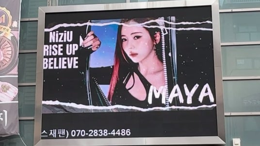 2024年9月9日(月)~9月15日(日)での期間で開催した「[K-STAR BOARD投票] 最高の「I Wonder・チャレンジ」のアイドルは?の投票において1位に選ばれたNiziUのMAYAさんの応援広告が、新大久保のK-PLAZA 1号館の屋外ビジョンで上映されております。