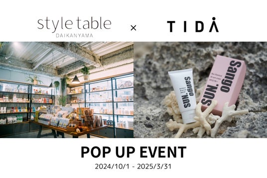 株式会社フラッグ(東京都港区、代表取締役:吹上直子)が展開するセレクトショップブランド「style table(スタイルテーブル)」の「style table 代官山本店」(運営:株式会社Liberty、本社:東京都渋谷区、代表取締役:三上結香)は、自然環境に配慮した日焼け止め「Sango SUN.」を生産から販売まで行うTIDA(代表:木邨朱里)と一緒にPOP UPイベントを開催する。