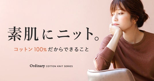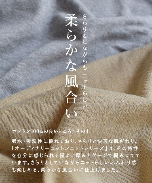 オーディナリーコットンニットシリーズは、快適な着心地を追求しコットン100%にこだわりました。素肌に直接触れても心地良く、肌に優しい質感を実現しています。