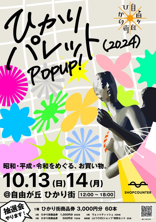 株式会社COUNTERWORKS(本社:東京都港区、代表取締役CEO:三瓶 直樹、以下「カウンターワークス」)が運営するポップアップストアの出店支援プラットフォーム「SHOPCOUNTER」のプロデュースにより、東京・自由が丘のショッピングアーケード型の商店街「自由が丘ひかり街」(運営:自由が丘ひかり街協同組合)を会場に、昭和・平成・令和といった3つの世代を超えたお買い物体験を提供するポップアップイベント「ひかりパレット」を、2024年10月13日(日)~10月14日(月・祝)の2日間、開催いたします。