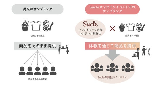 Sucleが開催する協賛オフラインイベントでは、Sucleが持つ熱狂的なコミュニティに向けて、若年層のトレンドになっている体験に掛け合わせて商品を訴求することが可能です。従来のサンプリングのように商品をただ提供するのではなく、Sucleが持つトレンドキャッチ力やコンテンツ制作力と掛け合わせ、広告に敏感な若年層に広告感を持たせずに、体験を通して商品を提供することができます。トレンドに合わせた体験を通して商品に触れてもらうことで、商品やイベントに対する熱量の高いUGCが生まれ、Sucleコミュニティ内でのブランドに対するロイヤリティの向上を狙うことができます。