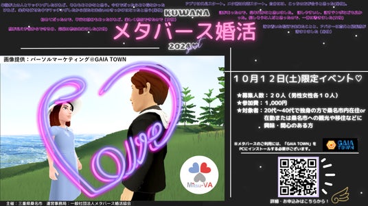 「はたらいて、笑おう。」をビジョンに掲げるパーソルグループのパーソルイノベーション株式会社(本社:東京都港区、代表取締役社長:大浦 征也、以下パーソルイノベーション)が手掛ける、メタバース婚活サービス『Mitsu-VA(ミツバ)』(https://www.mitsuva.jp/)は、三重県桑名市(市長:伊藤 徳宇、https://www.city.kuwana.lg.jp/index.html)が主催し、メタバース婚活協会が運営事務局であり、10月12日(土)にメタバース上で開催されるメタバース婚活イベント「桑名メタバース婚活」をシステム提供・運営面で支援します。