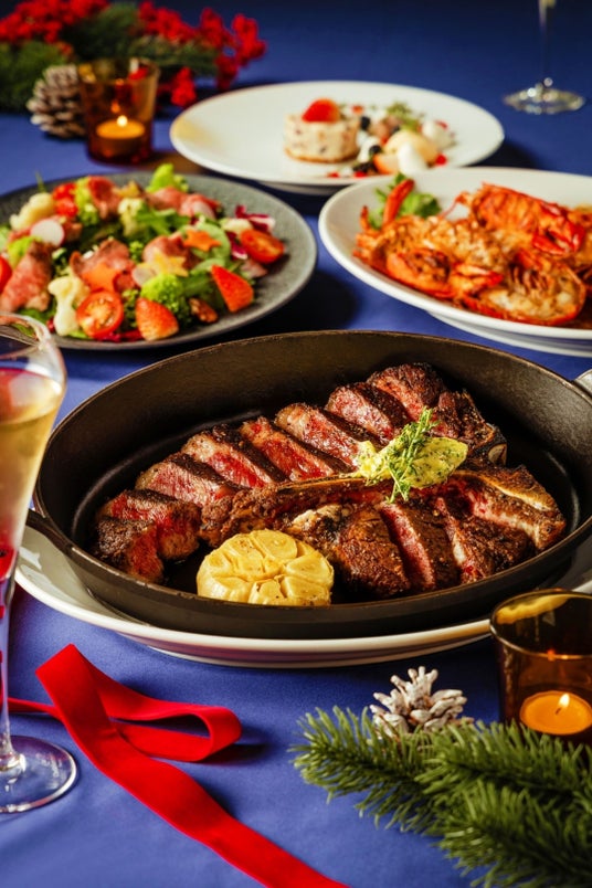 今年の「Christmas COURSE」は、BLT STEAK自慢の“アメリカンステーキ”をお楽しみいただけるよう、メインには「ドライエイジング プライム Tボーンステーキ 700g」をご用意いたしました。また、クリスマスリースに見立てた「ローストビーフのクリスマスリースサラダ」や、エビの殻を炒めて作りあげる本格アメリケーヌソースの甘味とコクが堪能できる「ロブスターグリル」などを提供します。