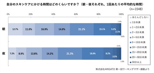 フェムケアのパイオニアブランド「Tant RUX」を展開する株式会社ARIGATO(本社:福岡県北九州市、代表:山崎いずみ)は、全国の20~40代のワーキングマザーを対象にスキンケアおよびフェミニンゾーン(デリケートゾーン)のケアについての調査を実施しました。フェミニンゾーンのケアを含めスキンケアにかけられる時間については6割強が「5分以下」と回答、フェミニンゾーンのケアを定期的に実施している人は31.1%、そのうち最も多いケア方法としては「フェミニンゾーン専用ソープまたは低刺激性ソープの使用」で52.1%でした。