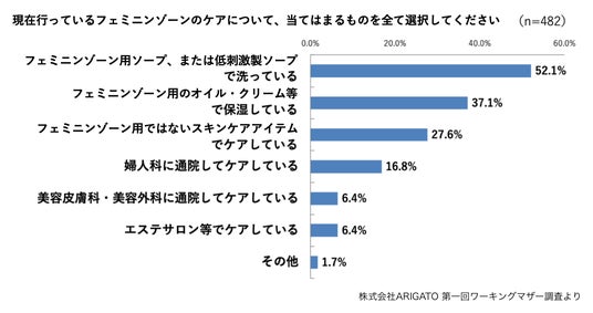 定期的にフェミニンゾーンのケアを実施している482名について、現在行っているケア(複数選択可)について質問したところ、半数以上が「フェミニンゾーン用ソープ、または低刺激性ソープで洗っている」を選択。次いで「フェミニンゾーン用のオイル・クリームでの保湿」となりました。一方で3割近くが「フェミニンゾーン用ではないスキンケアアイテムでケアしている」と回答しました。