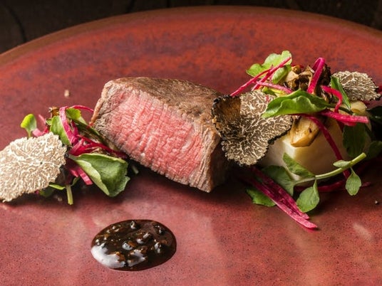 【メイン】 但馬牛のロースト ~丹波栗のリゾットと栗のラペ~ と 甘鯛のうろこ焼き ソースブランをお二人で