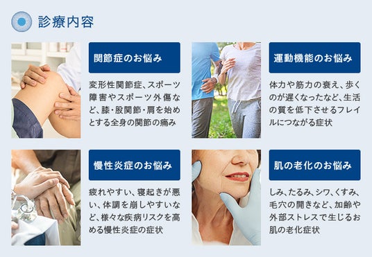 関節の痛みや体調不良など加齢に伴う症状、治療内容の疑問、費用のこと、効果についてなど、まずは気になることをお気軽にご相談ください。