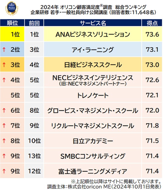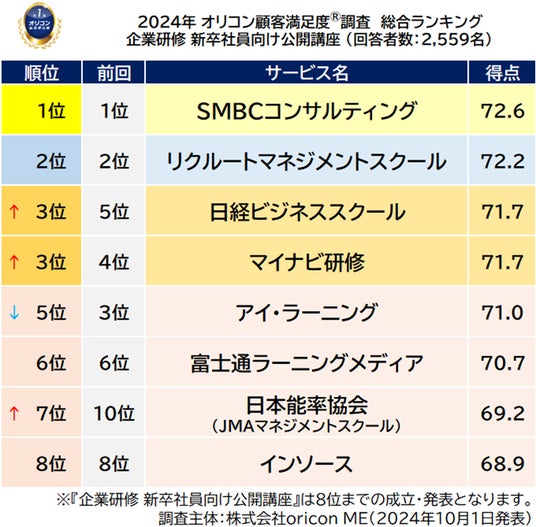 『企業研修 新卒社員向け公開講座』 総合ランキング_前回順位つき(2024年 オリコン顧客満足度(R)調査)
