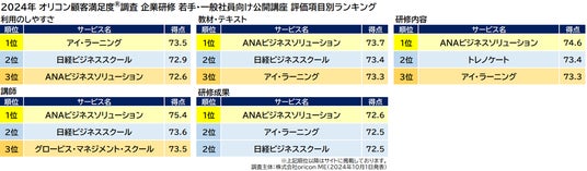 『企業研修 若手・一般社員向け』 評価項目別ランキング(2024年 オリコン顧客満足度(R)調査)