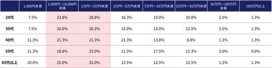 不正利用の被害額は1,000円~3万円未満が最も多く、全体の47.1%を占めました。特に1万円~3万円未満の被害額が25.3%、1,000円~1万円未満が21.8%と、被害者の約半数がこれらの範囲内で損害を被っていることが分かりました。年代別に見ても、多少の違いはあるものの同じような傾向が確認できました。