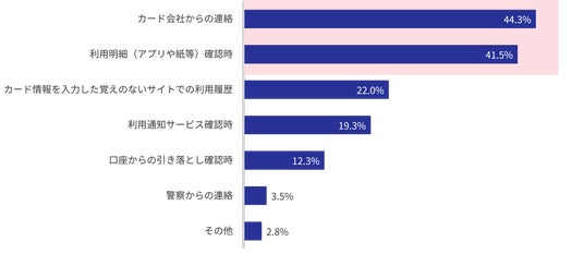 最も多かったのは「カード会社からの連絡」(44.3%)、次いで「利用明細の確認」(41.5%)でした。