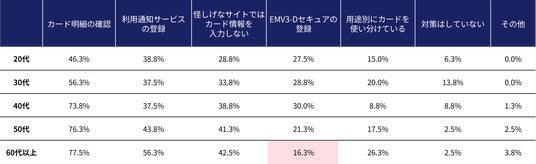 また、国が推奨する「EMV3-Dセキュアの登録」においては、20~40代の約30%が登録している一方で、60代以上はわずか16.3%にとどまりました。この結果は、高齢層における「EMV3-Dセキュアの登録」の浸透が課題になっていることが推測されます。