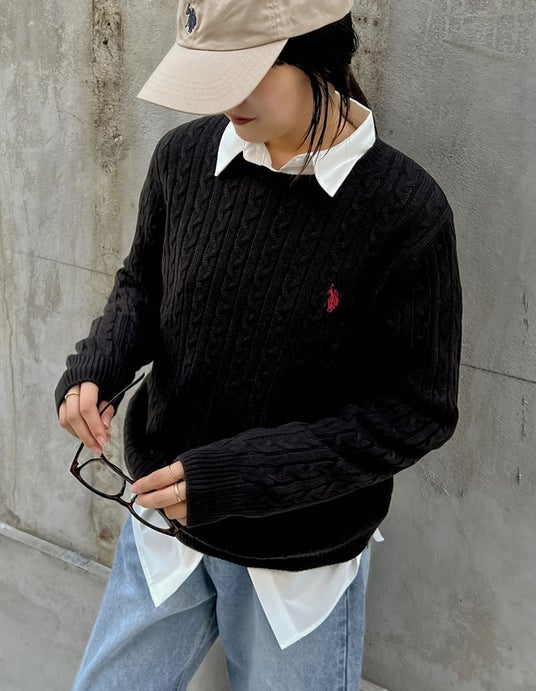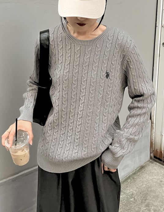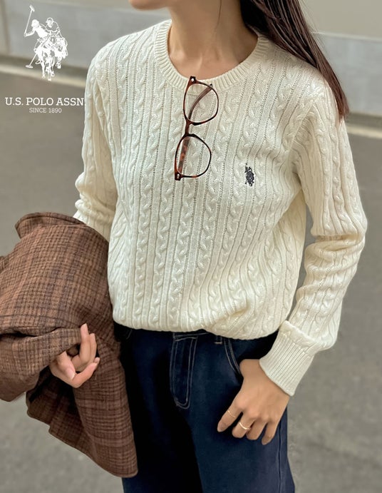 [U.S. POLO ASSN.][別注]ワンポイント刺繍ケーブルニットトップス