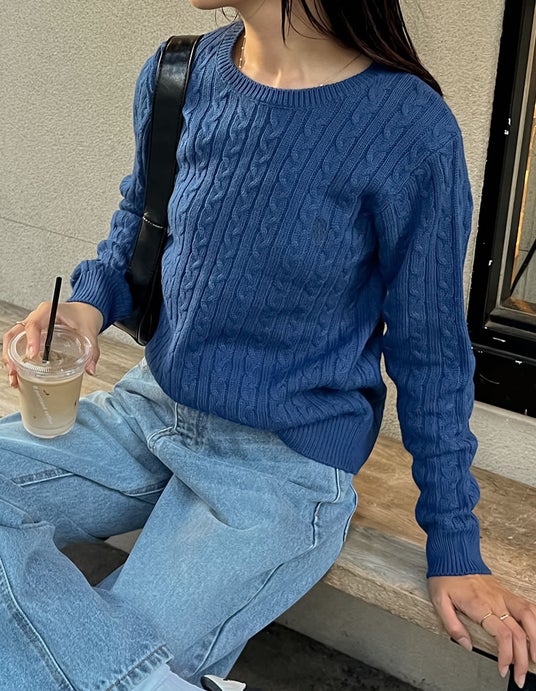 ベーシックなケーブル編みにワンポイント刺繍がデザインされたニットプルオーバー。